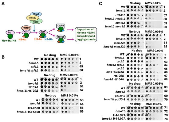 DNA replication-coupled chromatin assembly plays a critical role in DDT []. Given that Hmo1 associates with chromatin throughout the cell cycle [] and that Hmo1 can affect nucleosome structure and chromatin compaction [,,,], it is possible that Hmo1 contributes to DDT by impacting replication-coupled chromatin assembly. Nucleosome formation on nascent DNA is accomplished by the recycling of parental histones mediated by the replisome and the deposition of newly synthesized histones by chromatin assembly factors []. At the replication fork, the parental histone H3/H4 tetramer is displaced from the nucleosome and then distributed onto both leading and lagging strands by distinct strand-specific mechanisms. The transfer of histones H3/H4 to the leading strand is promoted by DNA polymerase Pol ε [,] and transfer to the lagging strand is governed by the PCNA-Pol δ and Mcm2-Ctf4-Pol α axes [,,] (Figure 4A). Notably, the nonessential Dpb3/Dpb4 subunit of Pol ε and Pol32 subunit of Pol δ both bind histones H3/H4 directly [,]. Moreover, the replisome component Mrc1 also plays a role in the symmetric distribution of parental histones to sister chromatids [,,] (Figure 4A). Newly made histones H3/H4 are deposited onto nascent DNA via a histone modification and nucleosome assembly pathway [,] (Figure 5A). In this pathway, the H3/H4 dimer associates with the histone chaperone Asf1, followed by the acetylation of lysine 56 of H3 (H3-K56-Ac) by histone acetylase Rtt109 and subsequent H3 ubiquitination (on K121, K122, and K125) by the Rtt101/Mms1/Mms22 ubiquitinase [,,]. Histone H3 acetylation and ubiquitination facilitate the transfer of the H3/H4 dimer from Asf1 to chromatin assembly factors CAF-1 (Cac1/Cac2/Cac3 complex) and Rtt106 that deposit H3/H4 on the nascent strand (Figure 5A). Defects in parental histone recycling or new histone deposition make cells sensitive to genotoxins []. For instance, the pol32Δ, ctf4Δ, or mrc1Δ mutation sensitizes cells to MMS (Figure 4B,C, compare strains 37, 43, and 47 with 1), and the deletion of any component of the new histone deposition pathway or changing H3-K56 to non-acetylable arginine (H3-K56R) also makes cells sensitive to MMS (Figure 5B,C).