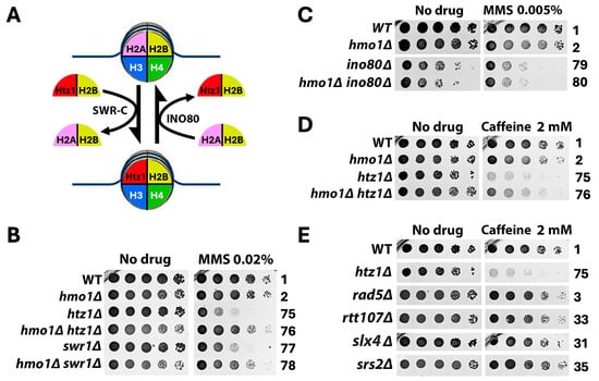 Hmo1 antagonizes the function of the histone H2A variant H2A.Z (Htz1) in yeast tolerance to MMS. (A). Mechanisms of the incorporation of Htz1 into chromatin and its removal from chromatin. SWR-C catalyzes the replacement of the H2A/H2B dimer in the nucleosome with the Htz1/H2B dimer, whereas INO80 catalyzes the reverse reaction. (B,C). Growth phenotypes of the indicated strains in the presence or absence of MMS. (D,E). Growth phenotypes of the indicated strains on medium with or without caffeine.