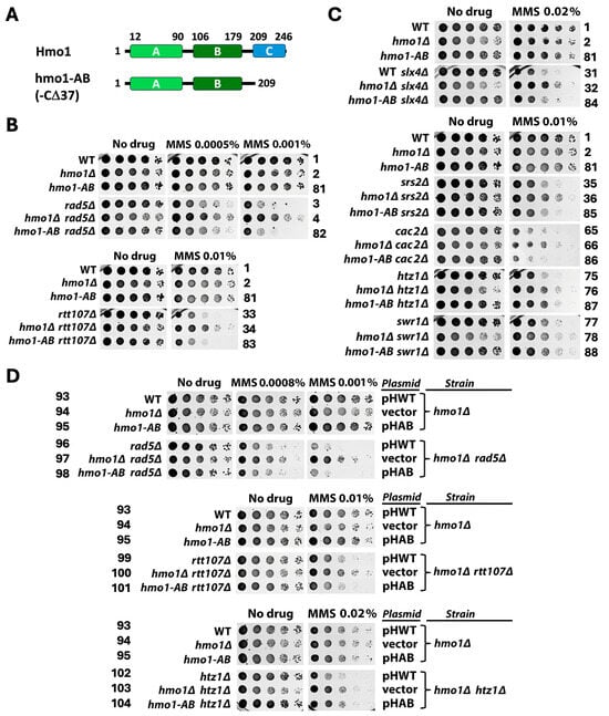 Our finding that hmo1-AB did not suppress the MMS sensitivity of the rad5Δ mutant is not consistent with an earlier report showing that the deletion of C-terminal 64 or 22 residues of Hmo1 (hmo1-Δ64 or hmo1-Δ22) partially suppressed the MMS sensitivity of the rad5Δ mutant []. The hmo1-AB allele we used here has been characterized in several prior investigations on Hmo1 functions [,,,]. It is deleted for the C-terminal 37 residues (from 209 to 246) of Hmo1 (Figure 7A), which is more than the deletion of the hmo1-Δ22 allele but less than the deletion of the hmo1-Δ64 allele used in the work of Gonzalez-Huici et al. []. Therefore, the discrepancy between our result and that of Gonzalez-Huici et al. is unlikely due to the difference in the size of the truncation of the Hmo1 alleles. Note that the strains we used here were derived from BY4741 (Table S1) whereas those used by Gonzalez-Huici et al. were W303 derivatives []. It is possible that the discrepancy regarding the role of Hmo1-CTD in MMS tolerance in the rad5Δ mutant stemmed from the difference in the genetic background between BY4741 and W303 [].