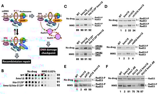 MMS induces the DNA damage checkpoint (DDC) in S phase [,]. DDC is initiated by Mec1 kinase bound to the ssDNA binding protein RFA coating ssDNA gaps and facilitated/amplified by the Rad9 mediator at stalled replication forks []. Rad9 is activated by Mec1-mediated phosphorylation, and phosphorylated Rad9 (Rad9-P) then binds and activates the checkpoint effector Rad53 kinase, which is autophosphorylated and phosphorylated by Mec1 []. Rad9 is recruited to damaged chromatin by Dpb11 and γH2A (histone H2A phosphorylated at S129, which is equivalent to γH2AX in higher eukaryotes) [] (Figure 8A). Notably, the DNA repair scaffold Slx4/Rtt107 is also recruited to DNA lesions by Dpb11 and γH2A [,,] (Figure 8A). The competition between Rad9 and Slx4/Rtt107 for binding γH2A and Dpb11 is thought to yield a dynamic balance between Rad9-mediated checkpoint signaling and Slx4/Rtt107-promoted DNA recombination repair [] (Figure 8A). Along this line, rtt107Δ or slx4Δ results in enhanced Rad9 recruitment and heightened checkpoint signaling, as reflected by increased Rad9 phosphorylation (Rad9-P) and Rad53-P in response to MMS [,]. We have recently found that blocking histone H2A-S129 phosphorylation by the hta-S129* mutation also increases the levels of Rad9-P and Rad53-P induced by MMS []. (Note the hta-S129* allele of histone H2A is deleted for the C-terminal four residues including S129.) This led to the notion that Slx4/Rtt107 normally outcompetes Rad9 for binding γH2A at DNA lesions induced by MMS (Figure 8A), and, consequently, γH2A negatively regulates DDC in response to MMS by hindering Rad9 recruitment [].