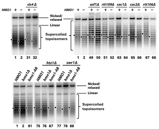 We found that none of the slx4Δ, asf1Δ, rtt109Δ, cac1Δ, cac2Δ, rtt106Δ, htz1Δ, and swr1Δ mutations affected 2μ supercoiling (Figure 9, compare strain 1 with strains 31, 49, 51, 63, 65, 67, 75, and 77). As such, the MMS sensitivity caused by these mutations was likely not due to a change in the general chromatin structure. The deletion of HMO1 from any of these mutants reduced 2μ supercoiling by a ΔLk of one, similarly to the otherwise wildtype strain (Figure 9, e.g., compare strains 31 and 32). Note that hmo1Δ suppressed the MMS sensitivity of the slx4Δ, cac1Δ, cac2Δ, rtt106Δ, and htz1Δ mutants (Figure 3, Figure 5C and Figure 6B) but did not affect the MMS sensitivity of the asf1Δ or rtt109Δ mutant (Figure 5B). These results suggest that there is not a simple link between how Hmo1 affects MMS tolerance and Hmo1-dependent negative DNA supercoiling as a proxy of chromatin structure.