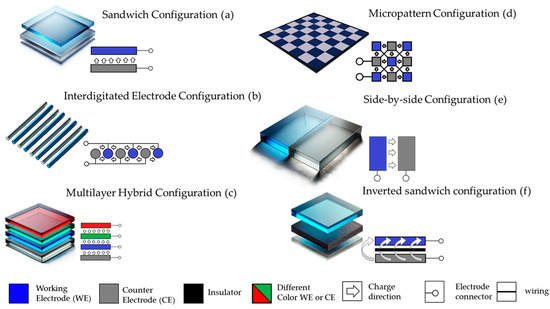 The diverse architectures of ECDs cater to a wide range of applications, from flexible wearables to advanced displays and energy-efficient systems. Each design presents unique advantages and challenges, and the choice of architecture depends on specific performance requirements and intended use cases. Different designs are presented in Figure 2. As fabrication techniques and material science continue to advance, novel architectures are expected to emerge, further expanding the potential of electrochromic devices in modern technology.