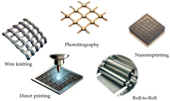 Metal meshes are fabricated using a variety of advanced techniques that allow precise control over their structure and dimensions, as well as depending on the metals or alloys used in the manufacturing process [80,97,98]. It is also one of the oldest and most researched methods for the manufacture of semi-transparent electrodes [99]. The choice of manufacturing method depends on the desired application, required resolution, and scalability needs.