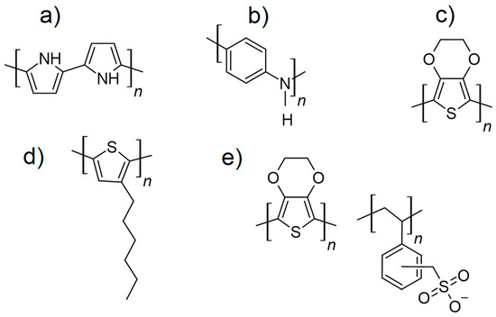 Structures of common conductive polymers, showing polypyrrole (PPy) (a), polyaniline (PANI) (b), poly(3,4-ethylenedioxythiophene) (PEDOT) (c), poly(3-hexylthiophene) (P3HT) (d), and poly(3,4-ethylenedioxythiophene)/polystyrene Sulfonate (PEDOT/PSS) (e).