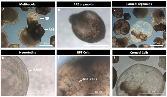 41. Isla-Magrané, H.; Veiga, A.; García-Arumí, J.; Duarri, A. Multiocular organoids from human induced pluripotent stem cells displayed retinal, corneal, and retinal pigment epithelium lineages. Stem Cell Res. Ther. 2021, 12, 581. [Google Scholar] [CrossRef]
