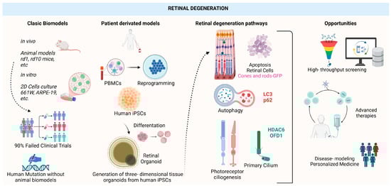 Figure 3. Generation of three-dimensional models based on the development of retinal organoids to study the mechanisms of retinal degeneration in various diseases. Initially, classical models were used to study these diseases, such as in vivo models like the rd10 mouse for RP research. It was also common to use 2D in vitro culture models with photoreceptor precursor cell lines, such as the murine 661W line or the human RPE line ARPE-19. However, the limitation of these basic experimental models is that they do not accurately mimic human diseases, and it has been observed that approximately 90% of clinical trials fail in the early stages. Additionally, another significant limitation is that certain human mutations causing retinal diseases occur in genes that are not conserved in murine models. Therefore, the generation of 3D in vitro models derived from patient iPSCs represents a significant breakthrough, enabling the precise and personalized study of various retinal pathologies. These models allow for the investigation of key pathways involved in retinal neurodegeneration, such as photoreceptor apoptosis, autophagy (LC-3 and p62), and ciliogenesis (HDAC6 and OFD1). Furthermore, these models serve as a valuable tool for high-throughput drug discovery, the development of advanced gene-editing therapies, and the design of personalized medicine.