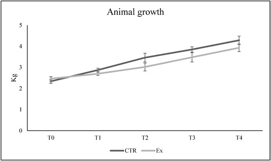 Growth curve of rabbits fed a regular diet enriched with a daily dose of a formulation consisting of SM-rich phospholipids + VD3 for 4 months. Weight was checked every month, at T0 (time 0) and after 1, 2, 3 and 4 months of treatment, corresponding to T1, T2, T3, and T4. The data represent the average weight ± SD of 6 control animals (CTR) and 6 experimental animals (Ex). Student’s t-test was used to analyze the significance of the results in Ex animals versus CTR animals, but no differences between CTR and Ex were statistically significant.