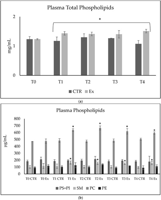 In order to study the role of SM-VD3 formulation in regulating plasma PL levels, we first chose to analyze the level of total PLs. The results showed that the plasma PL level in the Ex animals tended to increase slightly compared to that in the CTR animals, already after 1 month of treatment. The trend continued up to 4 months (Figure 2a, Supplementary Table S2).