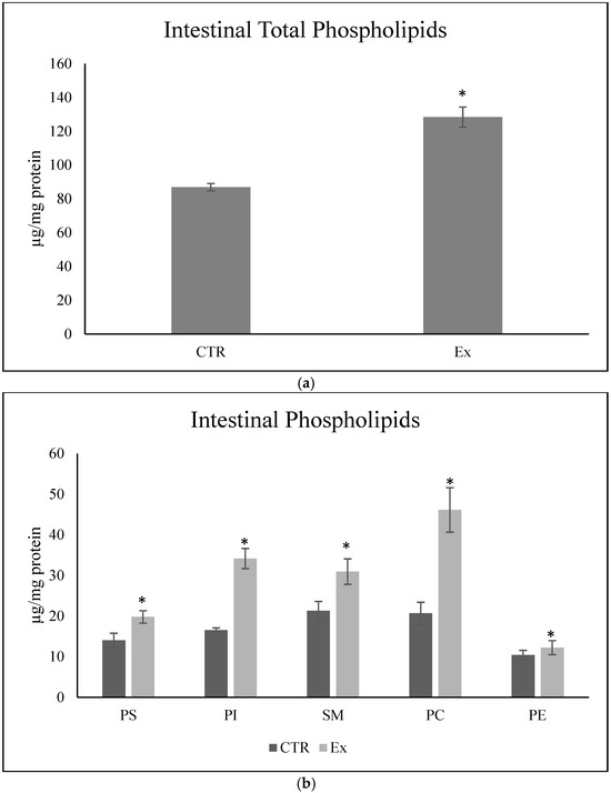 Total phospholipids (a) and each class of phospholipids (b) in the intestines from rabbits untreated (CTR) or treated with a daily doses of SM-VD3(Ex). Animals were sacrificed and the intestine was removed after 4 months of treatment, 1 h after the daily dose of SM-VD3. The data represent the mean ± SD of 6 CTR and 6 Ex animals. Significance was analyzed by t-test; * p < 0.05 versus CTR.