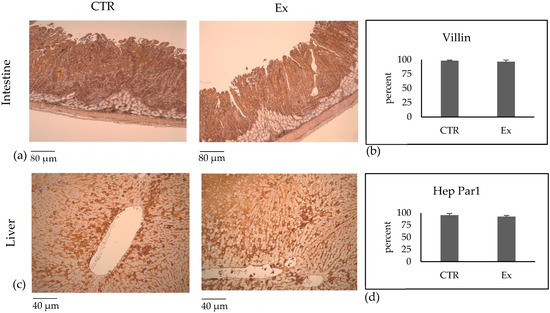 Immunohistochemical analysis of villin as marker for intestine cell differentiation and Hep Par1 for hepatocellular cell differentiation. The animals were sacrificed after 4 months of treatment with SM-VD3, 1 h after the daily dose. The liver and the intestine were removed. CTR, control animal; Ex, experimental animal. The analysis was performed, and images were acquired, as reported in Section 4. For the intestine, images were acquired at 50× magnification (a); for the liver, images were acquired at 100× magnification (c). (b,d) Evaluation of the percentage of positive cells. The data represent the mean ± SD of 10 different areas from 4 sections for each animal. Student’s t-test was used to analyze the significance of the results for the Ex animals versus the CTR animals, but no differences between the CTR and Ex animals were significant.