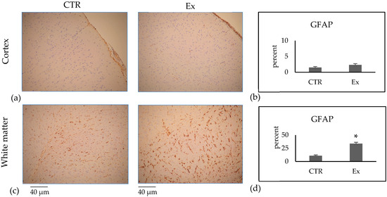 The results showed that the percentage of labeling was 1.5 ± 0.3 and 2.3 ± 0.4 in the cortex of the control (CTR) and experimental (Ex) groups, respectively, and 10.7 ± 1.6 and 33.8 ± 2.5 in the white matter of the CTR and Ex groups, respectively, indicating a 3.1-fold increase in GFAP expression only in the white matter (Figure 5c,d).