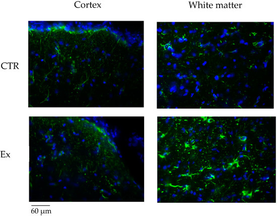 Immunofluorescence analysis of GFAP. Animals were sacrificed after 4 months of treatment with SM-VD3, 1 h after the daily dose. The brain was removed and the cortex or white matter was isolated as reported in Section 4. CTR, control animal; Ex, experimental animal. GFAP is shown in green; nuclei are shown in blue. The analysis was performed and images were acquired as reported in the Section 4. Images were acquired at 40× magnification.