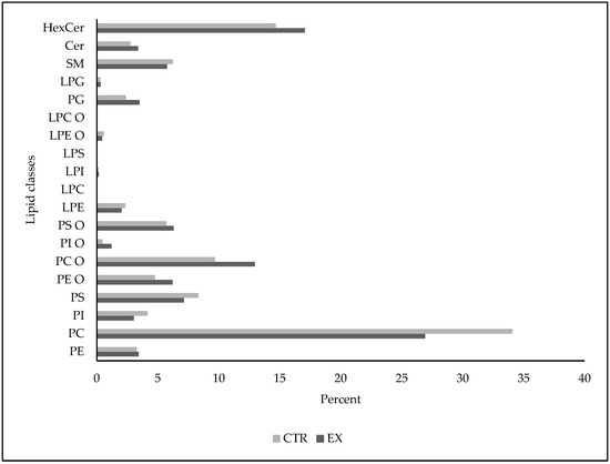 After 4 months of treatment, the Ex rabbit animals showed a relatively diversified profile, with a decrease in different GPLs, such as PC, PI, and PS, and the respective GPLs O, such as PC O, PI O, PS O, exhibited the greatest -fold increases. Otherwise, PE and PE O showed different, more modest fold changes, with an increase in PE and a reduction in PE O. The lyso molecules stayed relatively constant. Interestingly, the PG and LPG species that were the least abundant exhibited the greatest fold increases. Moreover, the SM species decreased slightly, and both Cer and HexCer increased (Figure 7).