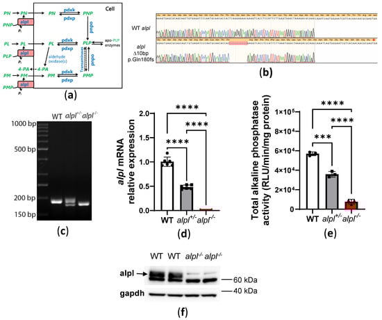 The zebrafish (Danio rerio) is a promising model organism in the study of human diseases [], including HPP [,]. Zebrafish have four genes coding for alkaline phosphatases: two for intestinal alkaline phosphatases, alpi.1 and alpi.2 (gene duplication), one for alkaline phosphatase 3, alp3 (also expressed in the intestine), and one for tissue-nonspecific alkaline phosphatase alpl, which also shows a high degree of genetic conservation with human ALPL [,]. In the present study, we generated the first alpl-/- zebrafish line using CRISPR/Cas9 gene-editing technology. Biochemical and behavioral characterization of alpl-/- zebrafish showed that they display multiple features of infantile HPP.
