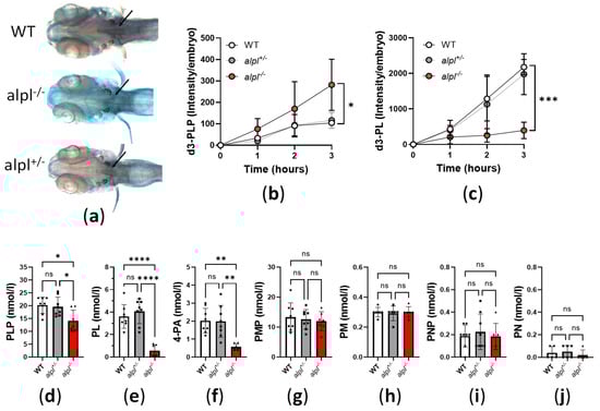 Impaired bone mineralization and abnormal vitamin B6 metabolism in alpl knockout zebrafish. (a) Decreased alizarin red staining of mineralized structures (notochord, indicated by arrows) in alpl-/- compared to WT and alpl+/- embryos at 5 dpf suggests a negative effect of alpl deficiency on bone mineralization. (b) Accumulation of d3-PLP and (c) decreased production of d3-pyridoxal (d3-PL) in alpl-/- compared to WT and alpl+/- embryos incubated with 100 µM d3-PLP in embryo water (E3) for 3 h at 28 °C. Data are means from n = 3 pools (3 embryos per pool) per time point and genotype ± SD. (d) Steady-state PLP, (e) pyridoxal (PL), (f) 4-pyridoxic acid (4-PA), (g) pyridoxamine 5′-phospate (PMP), (h) pyridoxamine (PM), (i) pyridoxine 5′-phosphate (PNP), and (j) pyridoxine (PN) concentrations in whole embryo extracts. Data are means from n = 8 pools (3 embryos per pool) per genotype ± SD. **** p < 0.0001, *** p < 0.001 ** p < 0.01, * p < 0.05, and ns—not significant (p > 0.05).