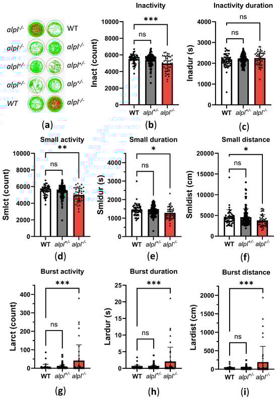 Locomotion analysis of 5 dpf old WT, alpl+/-, and alpl-/- zebrafish embryos. (a) Examples of swimming trajectories of 5 dpf old embryos recorded with Zebrabox for 1 h at 28 °C in the dark. Green—movement speed < 30 mm/s (small activity), red—movement speed > 30 mm/s (burst activity), black—no movement (inactivity). (b) Inactivity count. (c) Duration of inactivity. (d) Small activity count. (e) Duration of small activity. (f) Distance swum during small activity. (g) Burst activity count. (h) Duration of burst activity. (i) Distance swum during burst activity. Data are means from n = 45 (WT), n = 105 (alpl+/-), and n = 42 (alpl-/-) embryos ± SD. *** p < 0.001, ** p < 0.01, * p < 0.05, and ns—not significant (p > 0.05).