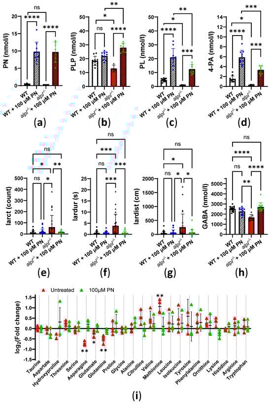 Normalization of biochemical and locomotion abnormalities in 5 dpf old alpl-/- zebrafish embryos after 72 h continuous treatment with 100 µM pyridoxine (PN). Concentrations of (a) pyridoxine (PN), (b) PLP, (c) pyridoxal (PL), and (d) 4-pyridoxic acid (4-PA) measured in whole 5 dpf old embryo extracts. Data are means from n = 4–10 pools (3 embryos per pool) per genotype ± SD. Zebrabox analysis of (e) burst activity count, (f) duration of burst activity, and (g) distance swum during burst activity in 5 dpf old embryos measured for 1 h at 28 °C in the dark. Data are means from n = 23–25 embryos per genotype and treatment ± SD. (h) γ-Aminobutyric acid (GABA) concentrations. Data are means from n = 7–15 pools (3 embryos per pool) per genotype and treatment ± SD. (i) Fold-change analysis of amino acid concentrations in untreated alpl-/- and 100 µM PN-treated alpl-/- zebrafish embryos compared to the corresponding WT group. Data are from n = 4 pools (3 embryos per pool). **** p < 0.0001, *** p < 0.001, ** p < 0.01, * p < 0.05, and ns—not significant (p > 0.05).