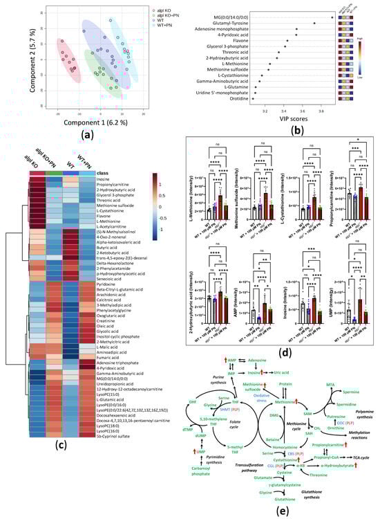 Global metabolic response to pyridoxine (PN) treatment in 5 dpf old WT and alpl-/- zebrafish embryos. (a) Partial least squares-discriminant analysis (PLS-DA) scores plot (principal component 1 (x-axis) and component 2 (Y-axis)). The explained variances are shown in brackets. 95% confidence intervals are shown for each group. (b) Important metabolites identified by PLS-DA for principal component 1. Metabolites with the highest variable importance in projection (VIP) scores are shown. The colored boxes on the right indicate the relative intensity of the corresponding metabolite in each group. (c) Heatmap visualization of group-average intensities of the 50 highest-ranking metabolites based on one-way ANOVA results. Euclidean distance and Ward’s clustering algorithm were used for the hierarchical clustering of metabolites. (d) Intensities of a selection of the highest-ranking metabolites based on one-way ANOVA results. Data are means from n = 10 pools (3 embryos per pool) per genotype and treatment group ± SD. **** p < 0.0001, *** p < 0.001, ** p < 0.01, * p < 0.05, and ns—not significant (p > 0.05); comparisons as indicated in the graphs. (e) Schematic visualization of metabolic pathways where strongest effects of Alpl deficiency were observed followed by normalization after pyridoxine treatment. Metabolites are shown in green; red arrows indicate the effect of Alpl deficiency. Key PLP-dependent enzymes are shown in blue: SHMT, serine hydroxymethyltransferase (EC 2.1.2.1); CBS, cystathionine-β-synthase (EC 4.2.1.22); CGL, cystathionine γ-lyase (EC 4.4.1.1); ODC, ornithine decarboxylase (EC 4.1.1.17).