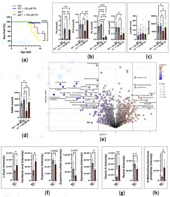 Progression of metabolic abnormalities in 10 dpf old alpl-/- zebrafish larvae. (a) Kaplan–Meier survival curves of untreated and 100 µM PN-treated WT and alpl-/- zebrafish until 10 dpf. Data are from n = 18–42 zebrafish per genotype and treatment condition. (b) Concentrations of pyridoxine (PN), PLP, pyridoxal (PL) and its degradation product 4-pyridoxic acid (4-PA) in untreated and 100 µM PN-treated WT and alpl-/- larvae. Data are means from n = 4–10 larvae per genotype and treatment condition ± SD. (c) Distance swum during burst activity (lardist, movement speed > 30 mm/s) and during small activity (smldist, movement speed < 30 mm/s) during 1 h measurement using Zebrabox at 28 °C in the dark. Data are means from n = 9–19 larvae per genotype and treatment condition ± SD. (d) Concentrations of GABA in untreated and 100 µM PN-treated WT and alpl-/- larvae. Data are means from n = 5–7 larvae per genotype and treatment condition ± SD. (e) Important features in metabolome of alpl-/- larvae selected by volcano plot with fold change (FC) threshold equal to 2 (x-axis) and t-tests threshold of p < 0.05 (y-axis). (f) Accumulation of L-Dopa and vanillactic acid, and decreased level of dopamine, dopamine sulfate (dopamine 4-sulfate and dopamine 3-O-sulfate) and epinephrine in alpl-/- larvae suggest impaired activity of aromatic L-amino acid decarboxylase. (g) Accumulation of vitamin A (retinol) and decreased level of retinal in alpl-/- larvae. (h) Accumulation of N-methylethanolaminium phosphate in alpl-/- larvae. Data are means from n = 5–7 larvae per genotype ± SD (panels E-H). **** p < 0.0001, *** p < 0.001, ** p < 0.01, and * p < 0.05.