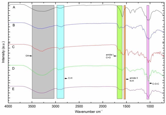 FTIR-ATR spectra of (A) solid CMC, (B) solid CHS, (C) DOX, (D) MControl (E) MDOX.