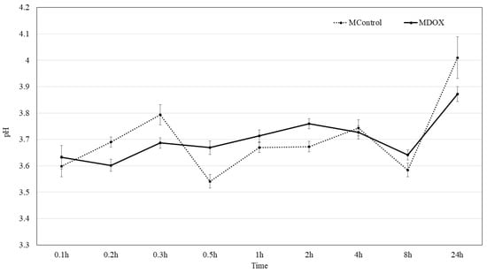 Graphical presentation of surface pH kinetic of MControl and MDOX.