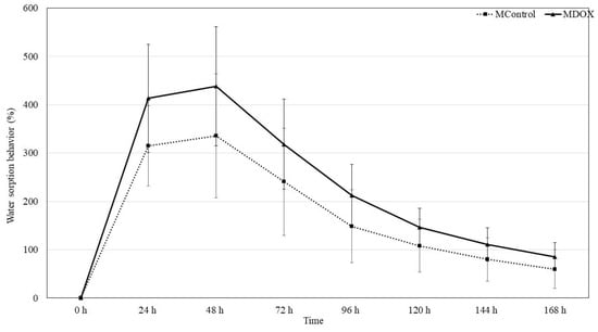 Graphical presentation of water sorption behavior of MControl and MDOX.