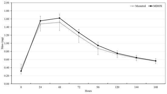 The biodegradation potential of the membrane is important for the formation of the extracellular matrix and skin repair. In tissue engineering, the scaffold should not be completely removed until the wound healing is complete. To evaluate the biodegradability potential of the CMC/CHS/G membrane, an SBF solution, which closely resembles human blood plasma, was used. The degradation behavior of the membrane was investigated over time (0, 1, 2, 3, 4, 5, 6, and 7 days) in the SBF solution at 37 °C and the results are shown in Figure 5. All of the membranes did not degrade after 1 week and maintained their weight during the second week (Figure 5). The mass gain values of MDOX and MControl exhibited similar behavior at 1, 2, 3, 4, 5, 6, 7, and 8 days but showed a statistically significant difference at time 0 h (p < 0.05). The membranes were formed through hydrogen bonds, ionic interactions, and other non-covalent interactions. These bonds maintained their structural integrity, forming a viscoelastic biomaterial with implantable ability, self-healing properties, and superabsorbency for wound tissue remodeling [].