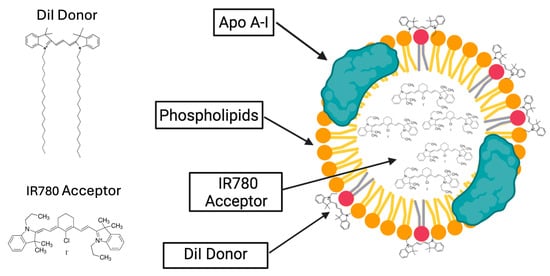 Schematic presentation of the dual fluorescent DiI-rHDL-IR780 NPs loaded with the acceptor fluorophore, IR780 iodide, and labeled with the donor fluorophore, DiI (in red), equipped with two 18:0 carbon chains inserted into the EYPC phospholipid layer (in orange) with the fluorophore moiety extended outwards from the surface of the NPs.