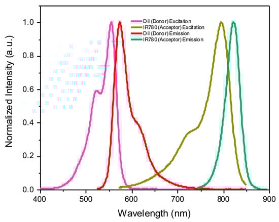 In the first part, we present a theoretical consideration of the expected results. We analyze anticipated changes in emission (in emission spectra and fluorescence lifetime for both the donor and acceptor) for a large NP system where the overall donor-acceptor separation significantly exceeds the characteristic Förster distance, R0 (separations over 2 R0). To experimentally confirm our theoretical predictions and assess payload loading, biodistribution, and payload release, we assembled rHDL nanoparticles in which IR780 iodide was loaded into the interior core of the rHDL complex, and the lipid layer on the exterior of the NP was labeled with DiI (1,1′-Dioctadecyl-3,3,3′,3′-tetramethylindocarbocyanine perchlorate), as shown in Figure 1. For NP preparations, we used a method we previously standardized [3], which consistently produces particles with an approximate diameter of 10 nm and an internal core size of about 4 nm. We maintained a constant density of DiI dye embedded in the lipid layer while increasing the IR780 payload by adjusting its concentration. The efficiencies for DiI labeling and IR780 loading in each preparation were confirmed by measuring the absorption spectra of purified NPs. As schematically presented in Figure 1, DiI molecules (donors) are embedded into the membrane with the main fluorophore moiety standing out of the membrane. The separation of DiI to the center of the NP core is at least the membrane thickness, which is in the range of 4 nm with a core radius of approximately 2 nm. The absorption and emission spectra for donor and acceptor fluorophores are shown in Figure 2 and show a large spectral separation. This results in only limited spectral overlap with an estimated characteristic Forster distance (R0) of approximately 2.8 nm (28 Å) for the DiI-IR780 pair, significantly less than the NP size. However, substantial spectral separation of the donor and acceptor will allow detailed analysis of observed spectral changes and, importantly, enable independent monitoring of intensity decays of the donor and the intensity decay of the acceptor with no crosstalk from donor emission. This will allow clear distinction in the intensity decays of donor and acceptor with excitation wavelength suitable for the donor. Consequently, this approach will constitute a straightforward method to monitor particle loading, particle stability, and disintegration, opening new avenues for future testing of developed nanoparticles and real-time monitoring of delivery and content release. When using more suitable FRET pairs with characteristic Forster distance, R0, in the range of 50 Å, the methods can be used for much larger particles in the range of 20–30 nm.