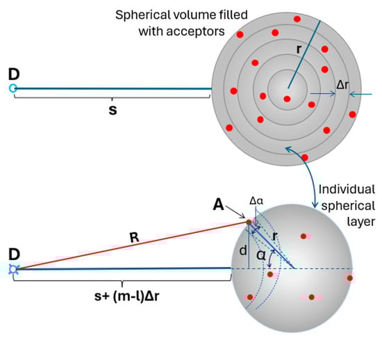 Previously we calculated the average transfer efficiency to the n acceptors randomly positioned on a small spherical surface like a globular protein [27] demonstrating that interaction can easily be extended to about 150 Å, over twice the R0 distance (9) just for 4–6 acceptors positioned/labeled on avidin surface. In the present approach, we are considering a spherical volume of a radius r randomly filled with n acceptors (Figure 3). Using results from our previous approach, we will calculate average FRET efficiency by dividing the volume of a sphere by a given number of spherical layers (so-called onion model—Figure 3 Top). Let us assume the volume is divided into m layers, each of a thickness Δr = r/m. The radius of each layer is rl = l Δr, and the volume of each layer can be described as Vl = 4πrl2Δr = 4π l l2Δr3 where l = 1, 2, …, m − 1. The sum of volumes for all layers is equal to the volume of a sphere of radius r (4πr3/3). Each layer will contain average acceptors.