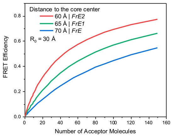 A total transfer to the entire volume/core will be a simple sum of transfer rates to each layer/shell. NPs prepared are approximately 10 nm in diameter with a core size of about 4 nm, as confirmed by Malvern Zetasizer using dynamic light scattering measurements. To approximate these conditions, we simulated the transfer efficiency for a system where the initial separation from the external donor to the center of the core is in the range of 60–70 Å (more than 2 times R0). In Figure 4, we present simulated transfer efficiencies as a function of the number of acceptors in the core for three different separations of the external donor to the center of the core: 60 Å, 65 Å, and 70 Å, assuming the R0 of 30 Å. It is clear that with only one acceptor randomly positioned in the core, the average FRET is too low to be experimentally measured (below 2%). However, with 5 acceptors in the core, we can detect changes, and with 10 or more acceptors, the effect should be significant in the range of 10%.