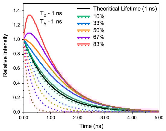 Figure 5, we present expected intensity decays for the donor (dashed lines) and acceptor (solid lines), assuming the initial populations of excited donors and excited acceptors are identical (50:50). For the simulation, we assumed lifetimes of 1 ns for the donor and the acceptor. At the initial stage of the decay, a clear increase in the acceptor population can be observed even for a small efficiency of 10%. Observing such a positive intensity decay component (pumping) in the acceptor decay would be undeniable proof of energy transfer since no other process can result in this type of change.