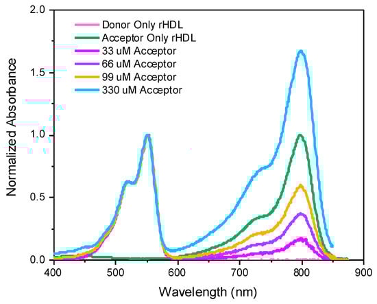 Normalized absorption spectra for dual fluorescent DiI-rHDL-IR780 NPs prepared with 4 different concentrations of loaded acceptor: 33 μM, 66 μM, 99 μM, and 330 μM of IR780. Donor (DiI) concentrations remained constant for all formulations at 214 μM. Spectra measurements for donor-only NPs, with a donor concentration of 214 μM, and acceptor-only NPs, with an acceptor concentration of 66 μM, are also included.