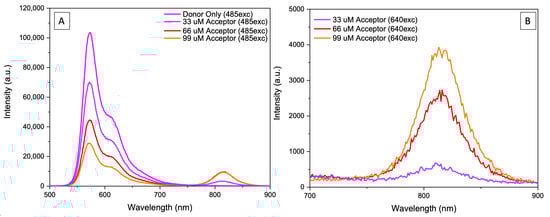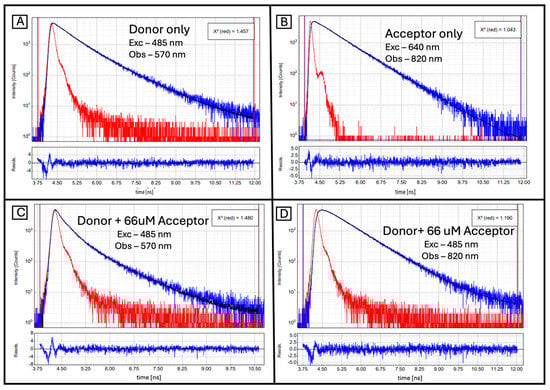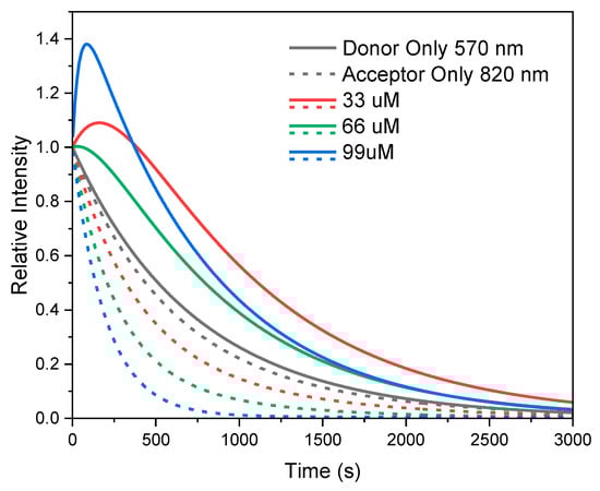 Supplementary Materials). The donor was excited at 485 nm, and emission was monitored at 570 nm. Acceptor-only samples were excited at 640 nm, and emission was monitored at 820 nm. Acceptor excitation at 485 nm produced a much lower signal due to the low absorbance, but both excitations (485 nm and 640 nm) exhibited practically the same intensity decay. The intensity decays for the donor-acceptor system (66 μM) were monitored at 570 nm, where only the donor emits, and at 820 nm, where the acceptor emission completely dominates. The emission of the donor is quenched by FRET, resulting in a faster intensity decay. Measured intensity decays for 33 μM, 99 μM, and 330 μM are presented in
