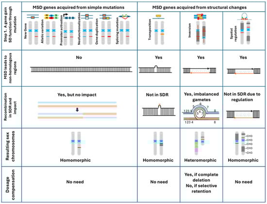 Recent advances in sequencing technologies have allowed the rapid discovery of the enormously diverse MSD genes in vertebrates and the mechanisms of their acquisition. A number of factors leading to structural changes in chromosomes result in the formation of sex chromosomes. These changes, such as chromosomal inversions, occur due to errors in homologous recombination, DNA breakage, and repair. Contributing factors include misaligned meiotic crossover, double-strand breaks (caused by radiation, chemicals, or oxidative stress), transposable elements, and non-homologous end joining. Additionally, replication errors, chromosomal instability disorder, viral integration, and unequal sister chromatid exchange can also play a role. These mechanisms lead to either paracentric inversions (not involving the centromere) or pericentric inversions (involving the centromere), ultimately influencing gene expression, evolution, and genetic disorder. Multiple-sex-chromosome systems are a result of chromosomal breakage, often at the most repetitive regions of the chromosome. It is apparent that the trajectories of sex chromosome evolution are a result of the acquisition modes of MSD genes: sex chromosomes with MSD genes acquired through simple mutations do not involve recombination suppression or degeneration; in contrast, sex chromosomes with MSD genes acquired through chromosomal inversions involve recombination suppression, which leads to the accumulation of transposable elements and sequence degeneration. Moreover, when the inversions are large in size, they may lead to the decay of the sex chromosomes. A key factor determining the evolution of sex chromosomes is whether inverted regions are created between the sex chromosome pairs for the acquisition of MSD genes. The creation of long inverted regions between the sex chromosome pairs provides a driving force for sex chromosome evolution []. Depending on the sizes of the inversions and the nature of the deletions during sex chromosome evolution, dosage compensation evolves when essential or haplo-insufficient genes are deleted. In contrast, regulatory mechanisms may have evolved in lower vertebrates with the selective retention of haplo-insufficient genes [].