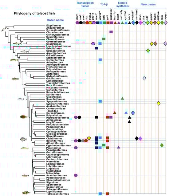 Divergent evolution of master sex determination (MSD) genes across teleost fish (Actinopterygii). Shown on the left is the phylogeny of teleost fish, adopted from Hughes et al. []. Shown on the right are MSD genes in various categories, such as transcription factors (circles), TGF-b (squares), genes involved in steroid synthesis (triangles), and “newcomers” (stars), illustrated in various colors and patterns, each representing a specific MSD gene. The symbols indicate where they each serve as MSD genes.