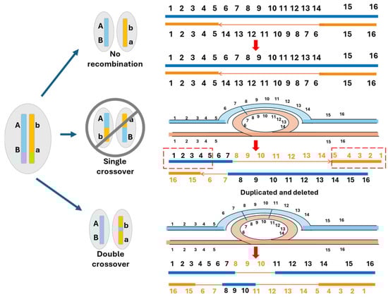 Based on analysis of the mechanisms of MSD gene acquisition, we propose a cause–effect model of sex chromosome evolution, which is depicted in Figure 2. The ways in which sex chromosomes evolve depends on how the MSD genes were acquired. Sex chromosomes carrying MSD genes acquired from simple mutations such as allelic variations, neofunctionalization, and gene duplication stay homomorphic, without recombination suppression or degeneration. Sex chromosomes carrying MSD genes acquired from translocation and transposition carry a small non-homologous region between the sex chromosomes; therefore, they develop recombination suppression within the transposed segments, but they remain homomorphic. Sex chromosomes carrying MSD genes acquired from chromosomal inversion carry inverted regions between the sex chromosomes. Recombination is reduced in the inverted region, but a single crossover in the inverted region causes deletion or duplication, which may be lethal to the gametes; they thus require double crossover to survive (Figure 4). Over time, such sex chromosomes degenerate and decay, especially with large inversions. A key factor for the evolution of sex chromosomes is whether non-homologous sequences are created during the acquisition of the MSD genes. Sex chromosomes with MSD genes acquired through simple mutations do not create non-homologous regions. In contrast, sex chromosomes with MSD genes acquired through transposition, inversion, fusion, and fission all create non-homologous regions between the sex chromosome pairs, leading to recombination suppression. Key differences in this model from the canonical sex conflict model include the following: (1) sex chromosome evolution resolves the structural problems created during the acquisition of MSD genes, such as the presence of inverted regions on the sex chromosome pairs; (2) recombination suppression is the result of inter-chromosomal non-homologous regions between the sex chromosome pairs and not of the intrachromosomal linkage of antagonistic alleles; (3) in spite of the reduced recombination due to inversion, recurrent recombination in inverted regions over time leads to deletions on the sex chromosomes. Sequence degeneration and the accumulation of transposable elements over time result in evolutionary strata.