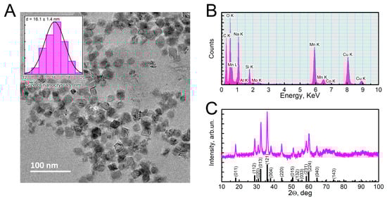 Characterization of synthesized Mn3O4 nanoparticles using transmission electron microscopy (TEM), energy-dispersive X-ray spectroscopy (EDS), and powder X-ray diffraction (PXRD). Synthesized Mn3O4 nanocrystals had rhombus-like morphology (panel (A), TEM image including size distribution histogram), their spectrum correctly included Mn and O elements (energy-dispersive X-ray spectroscopy, EDS, panel (B)), and the identified phase corresponded to Mn3O4 (XRD, panel (C)).