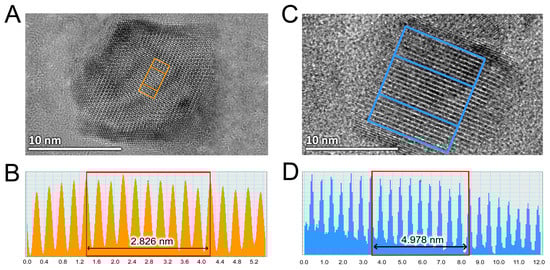 In contrast to the densely packed rhombic base, the rectangular side faces of the prism were less tightly packed and formed by (011) crystal planes (Figure 2C). The interplanar spacing corresponding to these planes on the surface of the prism’s side faces was approximately 0.49 nm (Figure 2D).