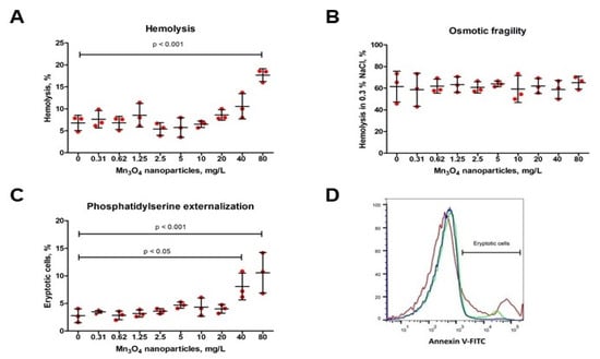 Mn3O4 NPs show good hemocompatibility: hemolysis assay (panel (A)) and osmotic fragility assay (panel (B)). Flow cytometry-based annexin V-FITC staining: identification of the percentage of phosphatidylserine-displaying eryptotic cells (panel (C)). Representative histograms show the percentage of eryptotic cells in the erythrocyte samples treated with Mn3O4 NPs (0 mg/L—blue line; 40 mg/L—green line; 80 mg/L—red line) for 24 h (panel (D)). ANOVA and Tukey tests, mean ± SD, n = 3.