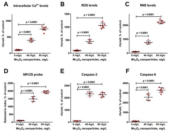 Quantitative determination of eryptosis parameters in erythrocytes incubated for 2 h with Mn3O4 nanoparticles at 0 mg/L (control samples), 40 mg/L, and 80 mg/L: intracellular calcium levels (panel (A)); reactive oxygen species, ROS (panel (B)); reactive nitrogen species, RNS (panel (C)); the single-cell ratiometric index, i.e., the ratio of the liquid-disordered phase-specific fluorescence intensity Fl red 633 nm to the liquid-ordered phase-specific fluorescence intensity Fl green 550 nm (panel (D)); caspase-3 (panel (E)); and caspase-8 (panel (F)). ANOVA and Tukey test, mean ± SD, n = 6. Note: rfu—relative fluorescence units.