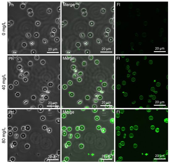 Laser scanning confocal microscopy-based detection of the calcium-specific fluorescence in erythrocytes treated for 2 h with Mn3O4 nanoparticles at 0 mg/L (control samples), 40 mg/L, and 80 mg/L. Merging combined the fluorescence channel with the phase contrast image. Scale bar is 20 µm. Note: Ph—phase contrast mode, Fl—a fluorescence mode reflecting the calcium-specific fluorescence intensity.