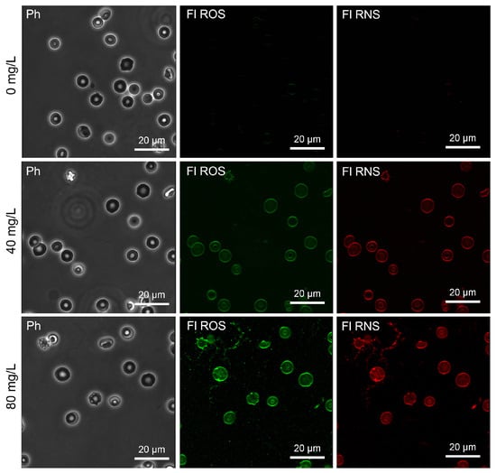 Laser scanning confocal microscopy: visualization of erythrocytes with the reactive oxygen species (ROS)- and reactive nitrogen species (RNS)-specific fluorescence exposed for 2 h of incubation to Mn3O4 nanoparticles (0–40–80 mg/L). Merging combined the fluorescence channels with the phase contrast image. Scale bar is 20 µm. Note: Ph—phase contrast mode, Fl ROS—a fluorescence mode indicating the ROS-specific fluorescence intensity, Fl RNS—a fluorescence mode demonstrating the RNS-specific fluorescence.