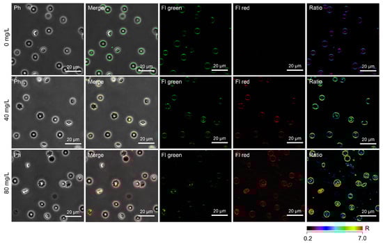 Laser scanning confocal microscopy-based analysis of the lipid order changes in the cell membranes of erythrocytes treated for 2 h with Mn3O4 nanoparticles at 0 mg/L (control samples), 40 mg/L, or 80 mg/L using the NR12S probe. The fluorescence channels were merged with the phase contrast (merge). Ratiometric images (R = Fl red/Fl green) are shown (ratio). Scale bar is 20 µm. Note: Ph—phase contrast mode, Fl green and Fl red—fluorescence modes showing the liquid-ordered and liquid-disordered phases, respectively.