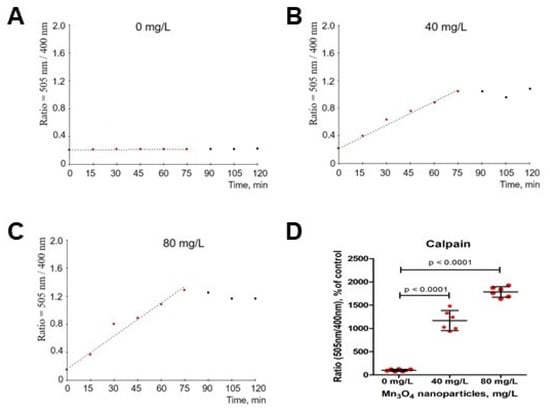 The representative curves representing the calpain activity in erythrocytes exposed to Mn3O4 nanoparticles at 0 mg/L (panel (A)), 40 mg/L (panel (B)), and 80 mg/L (panel (C)) for 2 h. The calpain activity was quantified by calculating the fluorescence intensity 505 nm (cleavage of the calpain substrate)/400 nm (native substrate) ratio. The calpain activity (velocity, v) was calculated in the linear region of the curve (panel (D)). ANOVA and Tukey test, mean ± SD, n = 6.