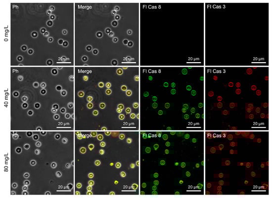 Laser scanning confocal microscopy-based assessment of caspase-dependent eryptosis. Detection of caspase-3- and caspase-8-specific fluorescence in red blood cells incubated for 2 h with Mn3O4 nanoparticles at 0 mg/L–40 mg/L–80 mg/L. The fluorescence channels were merged with the phase contrast image (merge). Scale bar is 20 µm. Note: Ph—phase contrast mode, Fl Cas 3 and Fl Cas 8—fluorescence modes demonstrating the activity of caspase-3 and caspase-8, respectively.