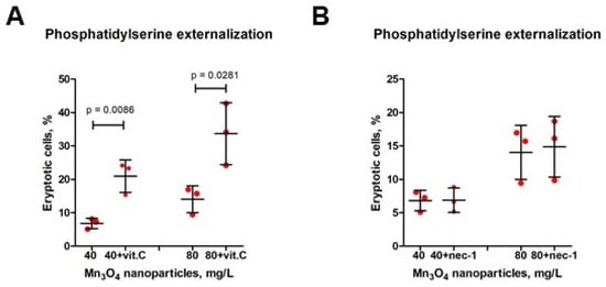 Our findings can provide insight into the clinical manifestations of Mn3O4 nanocrystal-induced toxicity. Indeed, since eryptotic cells are readily cleared from circulation, the acceleration of eryptosis is linked to anemia []. Moreover, eryptotic cells interact with platelets to increase blood clotting []. Eryptosis-associated endothelial damage might be attributable to the phosphatidylserine-mediated CXC chemokine ligand 16 (CXCL16)-dependent adherence of eryptotic cells to endothelial cells []. At the same time, this study indicates that nanomaterials are potential eryptosis-targeting nanodrugs. It can be admitted that further research focused on nanomaterial-induced eryptosis can help unearth the novel aspects of nanomaterial-mediated hematotoxicity as a whole and erythrotoxicity in particular. Currently, it is poorly studied how the various physical and chemical characteristics of nanomaterials (i.e., composition features, size, shape, charge, doping, etc.) might influence their toxicity against erythrocytes, which is an important issue in nanotoxicology and nanodrug discovery.