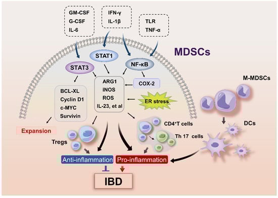 The paradoxical role of MDSCs in the pathogenesis of IBD. The expansion of MDSCs is driven by myeloid growth factors and inflammatory signals including GM-CSF, G-CSF, IL-6, etc. that activate STAT3. Activation of STAT3 in MDSCs upregulates their expression of BCL-XL, cyclin D1, c-MYC, and survivin protein to prevent apoptosis and promote proliferation of MDSCs. Inflammatory mediators including TLRs, IFN-γ, IL-1β, and TNF-α promote MDSCs activities by activating STAT3, STAT1, and NF-κB signaling pathways, leading to upregulation of arginase 1 (ARG1), inducible nitric oxide synthase (iNOS), and NADPH oxidase 2 (NOX2) that produces reactive oxygen species (ROS). These suppressive factors may alleviate IBD by suppressing effector T cell responses and promoting Treg activity. On the contrary, Th17 cells induced by MDSCs-derived IL-23 and DCs differentiated from M-MDSCs may exacerbate IBD.