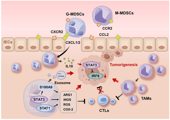 How are MDSCs recruited from the peripheral blood into inflamed colonic mucosa and tumors? Katoh, et al. showed that the pro-tumorigenic chemokine receptor CXCR2 was required for the recruitment of suppressive MDSCs, which was promoted by the PGE2-induced upregulation of CXCR2 ligands in colonic mucosa and tumors in an AOM/DSS-induced CAC model [97]. This was verified by the findings that downregulated CXCL2 reduced the infiltration of MDSCs and tumor growth, while early-life microbiota restricted MDSC-driven carcinogenesis by dampening the production of CXCL2 [98,99]. MDSC recruitment may also be mediated by other chemokines, cytokines, and growth factors. In AOM/DSS-induced and T-bet−/−, Rag2−/− CAC models, IL-6, CCL2, G-CSF, and GM-CSF (encoded by Csf2) fostered MDSC accumulation in evolving colonic tumors and boosted T cell suppression by MDSCs in a STAT-dependent manner [100,101,102]. In AOM/DSS-induced CAC, the number of MDSCs decreased significantly in Csf2−/− mice with thwarted cancer, whereas the adoptive transfer of MDSCs from tumor-bearing mice into Csf2−/− counterparts led to cancer recurrence [103]. Plasmacytoid dendritic cells (pDCs) impeded MDSC recruitment during AOM/DSS-induced CAC by producing type I IFN that suppresses the release of CCL2 and CXCL1 [104]. STAT1 is also required for G-MDSC accumulation in both the spleen and blood via IL-17 during the initial phase of CAC. The blockade of IL-17 in Stat1−/− mice diminished G-MDSCs in murine CAC [105], indicating the functional role of STAT1 and STAT3 in the recruitment and activation of MDSCs.