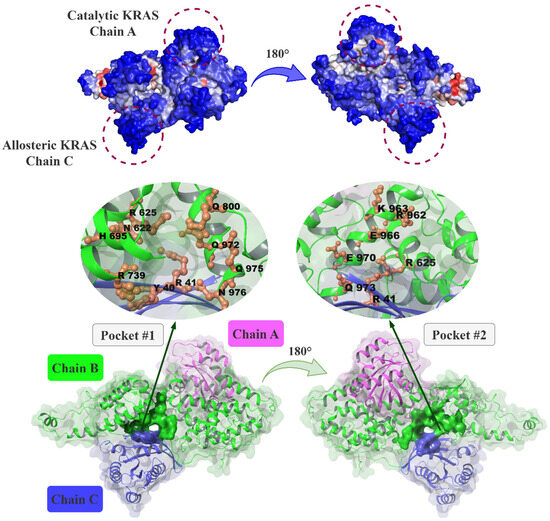 Residues that participate in orthosteric and allosteric sites, as well as those that regulate global hinge bending movements, were shown as essential [48]. The binding pockets of the ternary KRASG13D-SOS1 complex were assessed using ESSA and Fpocket [74], as implemented in ProDy 2.0 with default parameters [75]. In all calculations, heteroatoms and water molecules were removed from the crystal structures before calculations.